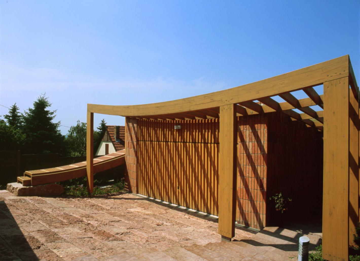 The villa is located in Pecs on the Western side of the Mecsek Mountain with a great panoramic view. The principal has asked the designer’s opinion well before the purchase of the site. Because of the wonderful natural environment, the main idea of the outline plan was to compose the villa into the scenery by turning up and carving the earth’s crust. The floors slide over each other like a terrace, forming the headroom freely and functionally exploiting both the interior and the outside surface of the floor. The fact that the villa fits into the environment and the application of a green roof are equally conducive to a favourable balance of heat both during the winter and the summer season. When choosing the materials we have turned toward natural building materials like stone, brick and wood complemented with sometimes overt, sometimes covert stainless steel. Similarly, the mine-stone blocks sometimes show their sawn, sometimes their split rustic surface to the pedestrian or the driver. The brick tiles were made of used bricks split alongside and the split surface has been cemented to the blocking brick walls showing it outwards. The whole is like a composition, the brick is its note flying freely, waving and swimming with the sometimes fine and sometimes stronger rhythm of the wood. Thus, the entire unit offers a relaxing living space.