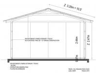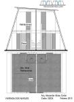 Techo de zinc corrugado calibre 29 sobre estructura madera pino y aislamiento térmico con planchas plywood pino una cara de 3/8”x4x8 anclado con tornillos a los parales empotrados en las paredes. El zinc colocado con tornillos con arandela de polietireno en correas de pino 2x3 fijas a las vigas con sujetadores metálicos.