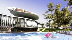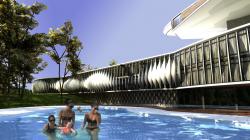 Budynek glówny projektu to hotel o czterech kondygnacjach. Posiada on jedna kondygnacje na poziomie -1, wylaniajaca sie z czesci wtopionej w skarpe , dwie kondygnacje naziemne oraz dodatkowa kondygnacje, która stanowi kapsula apartamentowa, wyniesiona na nodze betonowej. Ponadto od strony rzeki zaprojektowano magazyn przechowywania kajaków , który znajduje sie na poziomie -2 , pod basenem rekreacyjnym i jest dostepny tylko z zewnatrz. Zalozeniem projektowym bylo podzielenie rozciagnietego horyzontalnie obiektu na 4 strefy,