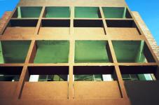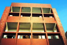 The fenestrations are well protected from the vagaries of weather by roof overhangs together with a combination of horizontal and vertical concrete louvers in the form of trellis work. Adequate light and ventilation has been provided to the central service core through duct, stairwell, and skylight. The building-form with its bold, minimalist, and unified external expression, looks gigantic and monumental in spite of its small scale.