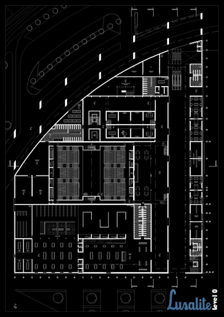 Cultural Center Lusalite: Integrated in the Riverside Plan for Algés - Cruz Quebrada (West Lisbon), the project consists in the rehabilitation of a well known national tile factory called Lusalite, created in 1930. Located between Cascais Railroad and the River Tagus, the building occupies 10 000 square meters and 2 levels. Due to the urban position, the intervention redesigns the North limits of the factory and the railroad, to unify them; the surrounding areas are designed in order to recreate an ambience of a Forum, relating public space and the water as a theme, taking advantage of Jamor stream. I: As a cultural equipment, it explores the Art Factory Concept with a Library, an Open Theater Scene, a Photographic Studio, a Multimedia Laboratory, a Recording Studio, an Events’ Stage, dressing rooms and all the needed technical and administrative dependencies. II: As an Infraestructural building, in the upper level there is a train station and a Lounge Area with a Bar that explores the relationship between levels and redefined interior properties. III: As a Commercial building, the creation of a two-storey Arcade with 8 shops and 8 bar/restaurants reinterprets the pre-existing space characteristics, emphasizing the interior and exterior relations which define a circulation scheme that relates the old and the new spaces in a continuum across the levels.