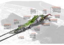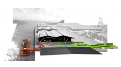 Sandwiched between flows of inbound and outbound, lies a long, narrow lot, approx. 60m wide x 1000m long. Keeping the first phase within the boundaries of the road will allow for the port (in whatever capacity) to function. Program is stacked vertically with undulating topography. Rising above the traffic and the port the visitor has a new vantage point of the surroundings. A visual connection to water and mangroves is made.