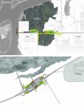 Functions are divided into to and from. Service roads of varying speeds, fast to slow, determine location of program and speed in which it is accessed and used. Here the road splits the site through the middle creating mirrored elements of opposite conditions. Transit hub at the central core creates inter-provincial links to surrounding cities. Utilizing a looping road technique and allowing pedestrian ROW along the outside edge helps to further organize and contain development. This condensed form allows for adjacent plots to be non-urbanized.