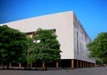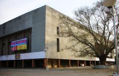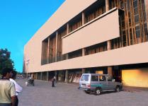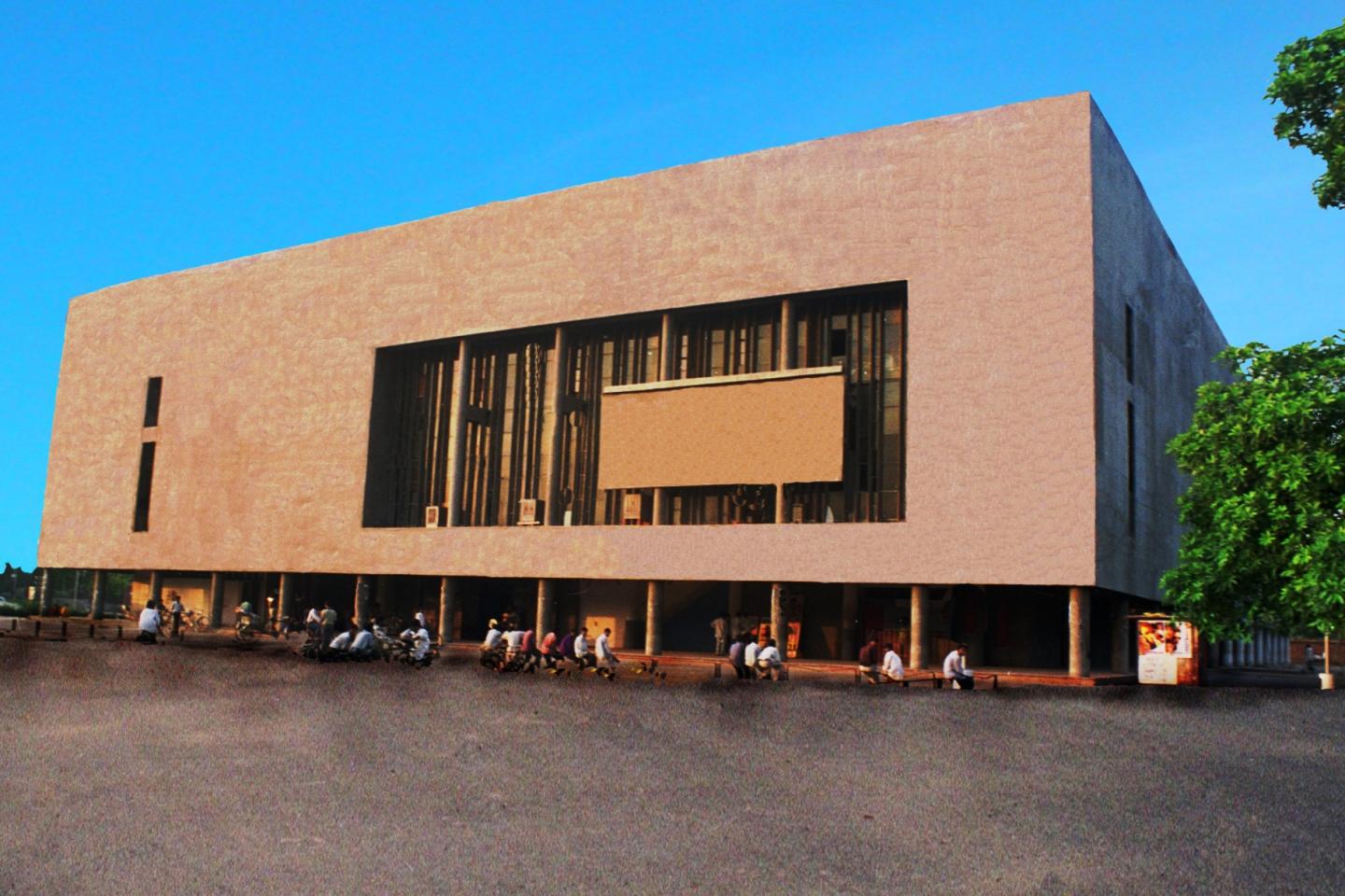 Of reinforced concrete with exposed shuttering marks, the massive rectangular structure is raised above ground level on cylindrical piloti. Around the perimeter, these are extended upwards as columns in front of large, deeply recessed areas of undulatory glazing and panels for attraction posters. The external expression of the gigantic cuboid measuring 75 x 53 x 17 metres echoes the Corbusian style of architecture. Being located in the vicinity of master architects Capital City of Chandigarh, the building is envisaged as a humble tribute to Mon. Le Corbusier. By virtue of its bold and simple form, Bassi Cinema Complex is acting as an important landmark in the urban settlement of S.A.S. Nagar.
