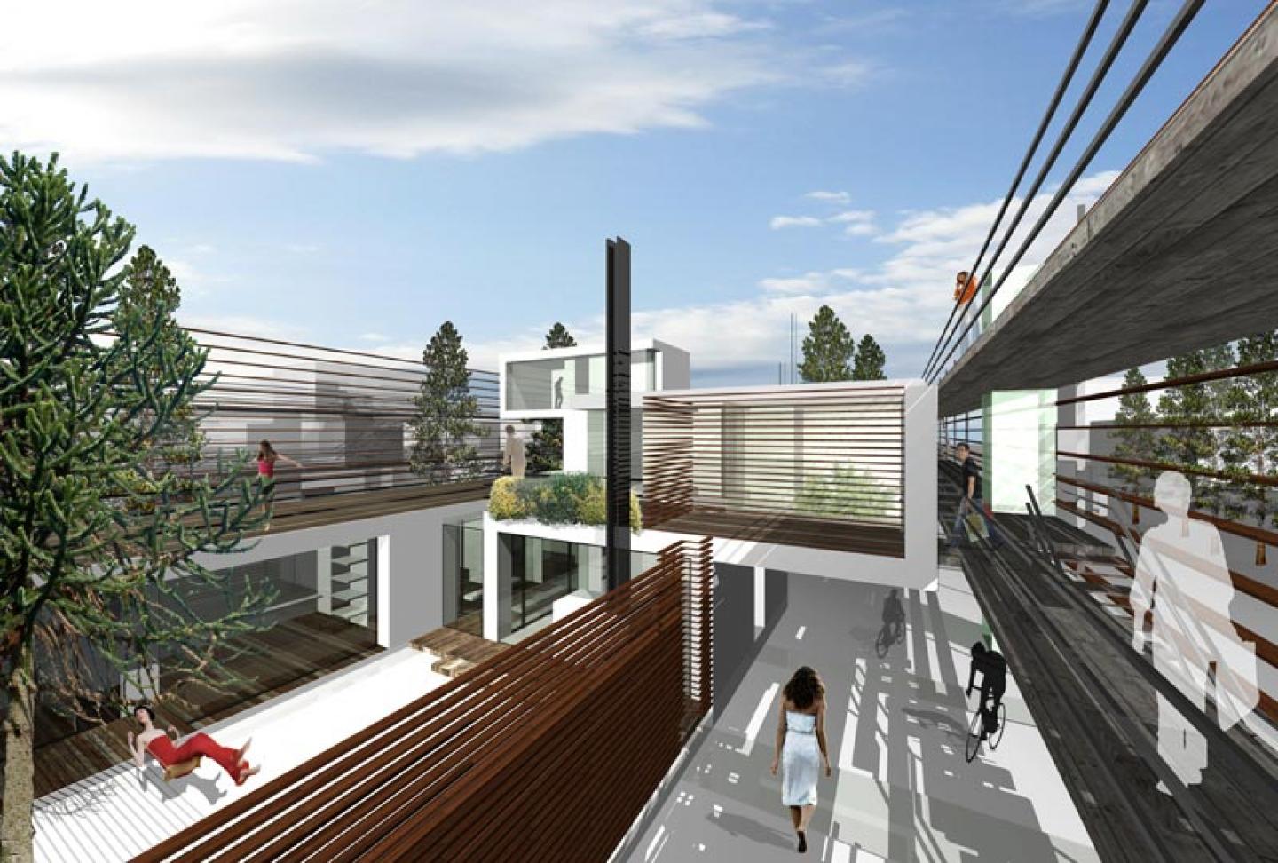 1.the residential area - 2.the main public spaces system with a new square and with a solar park containing a series of green houses with eco-sustainable energetic solution - 3.the green wedge along the E45 - 4.the weststrand park with sport facilities and leisure - 5.the waterfronts.