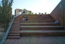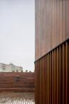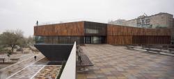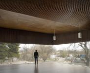 The relationship with the adjacent urban spaces and the topographic features of the site become active conditions for the implementation of the building, making the levels of the different floors and entrances coincide with the already existing ones. These relationships can clearly be seen in the project section that also expresses the extension of the public space of the entrance, via the roof and the configuration of the building as a platform-viewpoint onto the Ebro river. The contrast between the solid podium of the platform, a continuation of the walls of the pre-existing electrical substation, and the lightness of the glass and wood pavilion that rests on this level, is one of the formal characteristics of the project, which also responds to the functional organisation of the different uses.