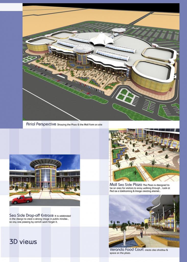 Investing in a cornish sea facing large site to produce an enjoyable and entertaining shopping experience that is as busy as shopping is with moments of calm recreation thats as calm and as walking by the beach, thats attempted by creating sea-view enjoying 3ed floor veranda cafes and restaurants setting areas thats divided by the entrance atrium to segregate family from male bachelors as its the enforced custom in Saudi Arabia. Also a front plaza adds an outdoor setting thats rarely offered in the hot-humid city but creates new opportunities of interaction at evenings and good weather days.