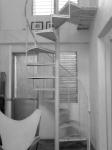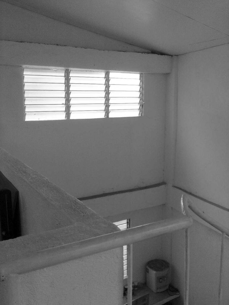 Low cost 36 sq.mts studio for an architecture student. With a very limited space in between buildings, the idea is to provide a 1 meter vent space on Northern and Southern sides. The Eastern side will be a firewall, while the Western side is along an alley. The western side wall posed a heating problem from the afternoon sun. Instead of putting up windows on this side, a loft was planned to be 2.5 mts away from the wall creating a double height space acting as a heat dissipator. Ample jalousie windows on the Northern and Southern side for cross ventilation.