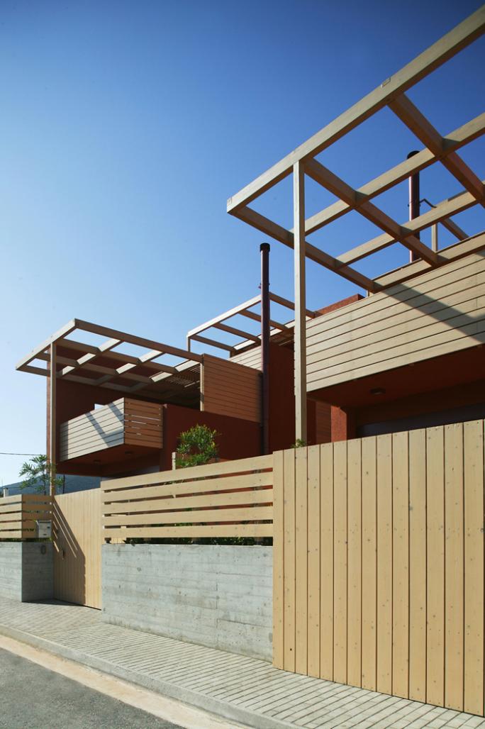As facades withdraw from the streets, the houses open up, and pergolas and screens frame views on the first floor, while on the second floor, two of the houses, view towards the sea front and the other two towards the mountains.