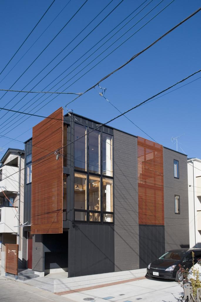 The façade of this house is made by several kinds of materials like a patchwork. This façade creates rhythm in the scenery of the town in this monotonous area. This house is united with town through the louver like the veil in the daytime, and bring soft light to town through the veil at night.