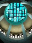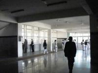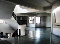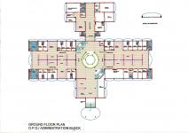 The Outpatient Department-cum-Administrative Block is strategically located on the southern side facing the main entrance to the hospital. By virtue of its location this block becomes a landmark in the entire campus. The three-storey building has a covered area of 8475 square metres, and is cross-shaped in plan. It accommodates registration, records, waiting spaces, consultation rooms, medical emergency, and ECT wings at ground floor level. At the first floor level, there is diagnostic wing comprising laboratory, CT scan, X-ray, EEG, ECG, etc., besides a library, lecture halls, seminar hall, exhibition hall, and some administrative offices. The remaining offices have been accommodated at the second floor level. All the floors are vertically linked by a lift, two staircases, and a ramp adjusted in the core of the building. The circular ramp serpentines round a triple-height atrium, which receives daylight from top. This feature adds to the spaciousness and grandeur of the inner core.