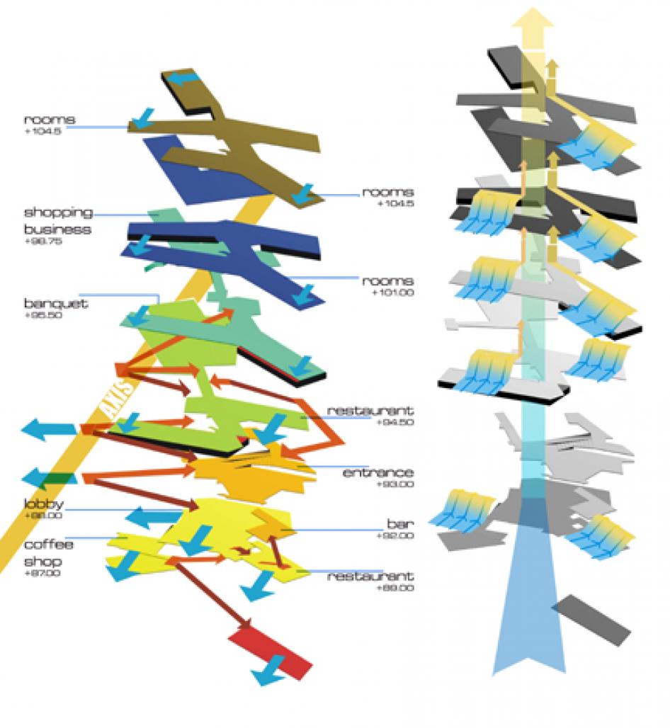 The building form is achieved by linking existing trees on the site to form tree clusters such that the building then evolves in the interstices left between the trees - many of which are very old and belong to rare species.