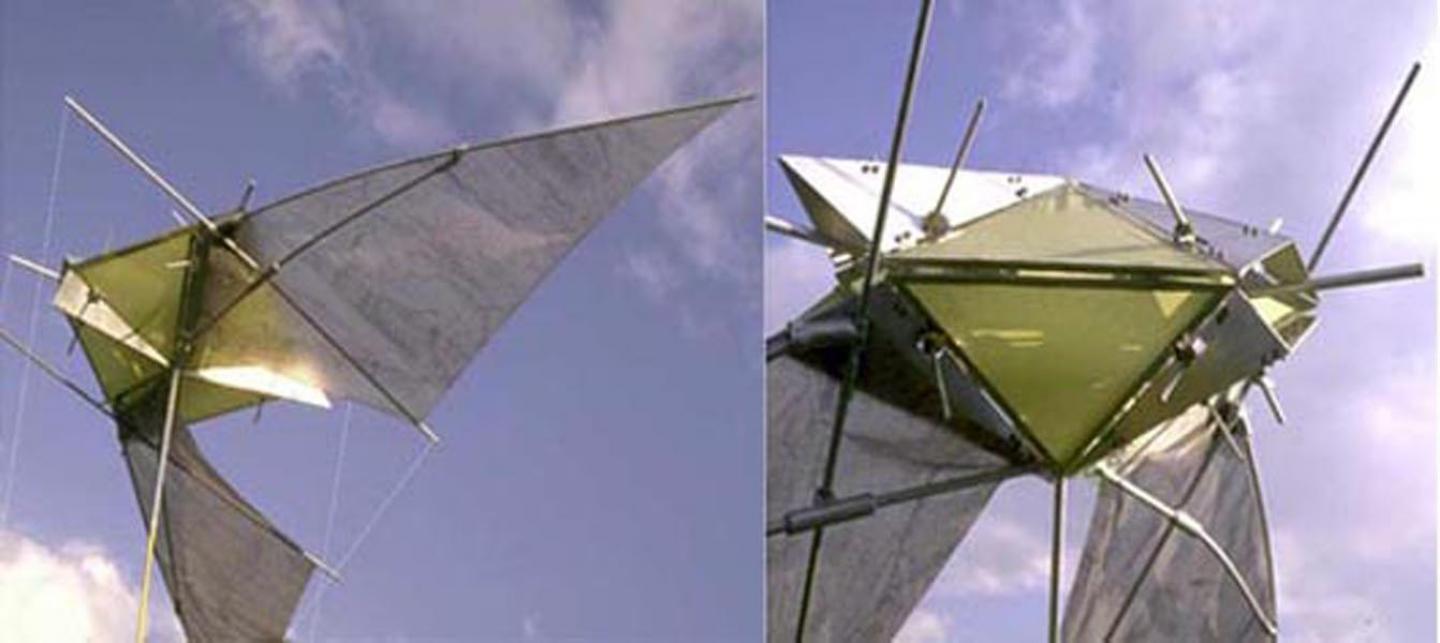 Flarke is a capsule installed on a cliff. Its wings unfold in the wind and lift the Flarke up in the sky. Simultaneously a cave house withdraws into the rock. People within the rooms are able to change the structure and location by a shift of the balance.