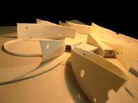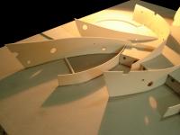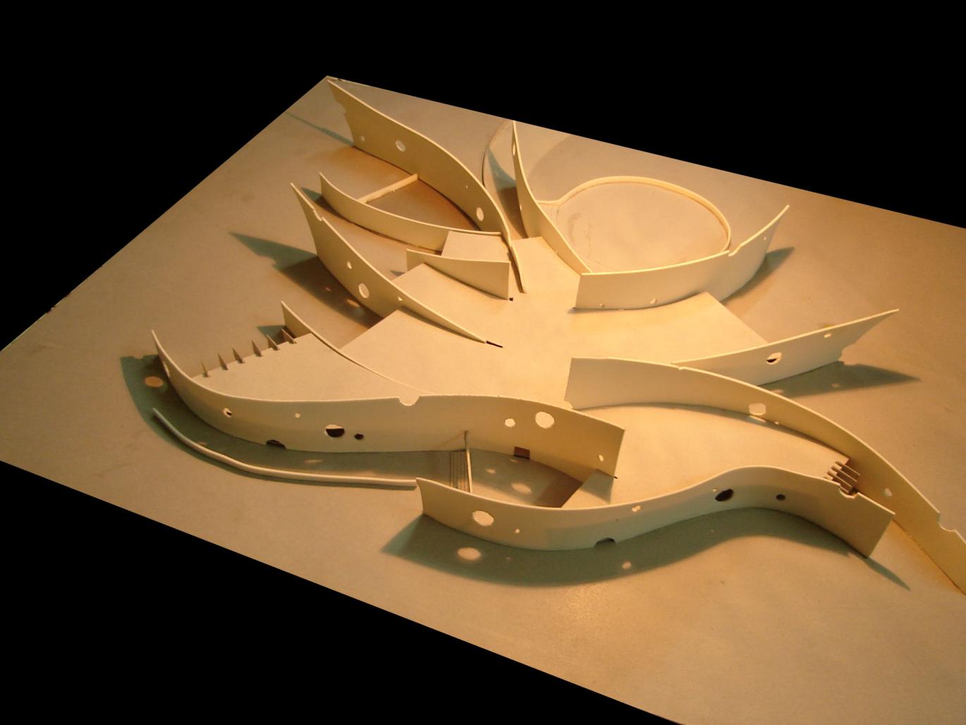 In this particular case, the design is inspired from the poetic curves of a shoreline - part wave, part boat & part bird. It would be like a ship anchored at seashore, its rust iron colored body floating over green grass waves. Playful irregular portals will further strengthen the identity of a ship, the experimental forays of contemporary art & create interesting fenestrations.