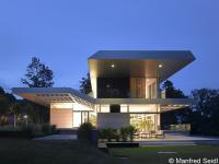 One approaches the building crossing the small pond one is invited to take a breathtaking panorama view of the city before entering the central hall of the house. This area is covered with a huge cantilevering roof. Picture Nr 13, 15
