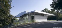 The Roof is a steel beam grid structure with aluminum panel cladding. On the southern and western side of the building the roof cantilevers beyond the terraces so as to provide an efficient sun protection in summer. The low winter sun warms up the interior space. This implementation of the passive energy concept is supported by a recuperator in the ground and sun collectors in the garden.