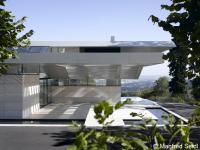 The property is about 5000m2 in a protected green zone with an old tree population. On the more slanted east side there is a small fir forest, whereas scattered broad leaf trees cover the widows of the western slope. This led the architects to orient the living areas towards south west. This side is entirely open to the panoramic view over the city and the garden.