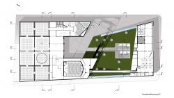 The Research Center is covered by an inclined planted slab, under which its spaces are arranged in a stepped way. The planted roof is accessible and open to the city, offering a green area and substituting a significant amount of the lost ground from the building construction, while the “atriums” in combination with the north directed skylights, ensure natural ventilation and cooling of the building.