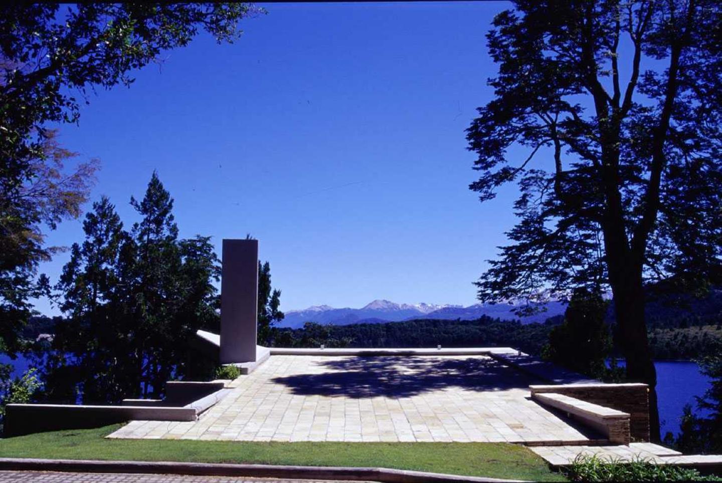 The approach to the building is slow and deliberate, subtly developed on the basis of some particular features of the geography, the trees and the views. The limits of the construction become confused with nature, where the escarpment becomes the slab, and the slope the stair. This is the exact place where the point of panoramic view of the water surface becomes the pivot of the pedestrian and processional path towards the house, which ends in a courtyard with its access perfectly established by the architecture and the slope.