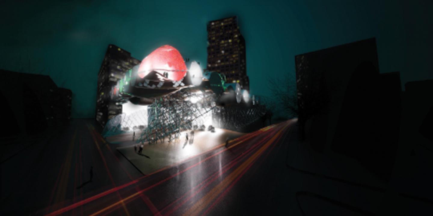 bubble wrap blends a necessity for a pure, clean, livable, breathable city with the need for a new interpretation of public space and infrastructure. it is a parasite powered by the excess energy of public transit and the exhaust pollution from our cars and buildings. it provides us with a public space, an air-purifying utility, and a cultural venue.
