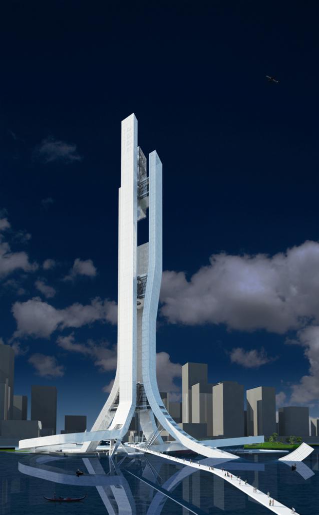 The design also incorporates a delicate pedestrian bridge that extends up from the east west canal way to the east and west of the Park and subtly bypasses the tower by looping around the shuttle elevator tubes at the center of the tower void. This bridge allows pedestrians to take a journey across the width of the park at an elevated position and offers a unique experience of passing through the center of the axial voids formed by the tower legs. From within the Central Lake Park, the bridge is perceived as a thin line connecting the two sides of the city together.