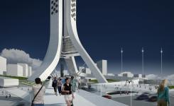 Not unlike the parabolic voids at the Eiffel Tower’s base within the Parc Champs de Mars, City tower’s sinuous legs fan out at the base to create a dynamic urban multi-level outdoor space defined by the trussed tube structures above and plaza architecture below. This is an essential urban design quality of the City Tower design which the preserves the visual corridor along the east west canal axis and north south axis and crafts a surreal visual and spatial experience. It is this informal space that bridges the more urban experience at the ground level with the more ethereal and emotional experiences within the tower structure.