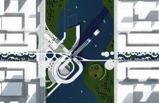 The footprint of the tower, podium massing and plazas creates a land mass that projects east into the center of the Central Lake Park. Projecting west from the mouth of the east west canal way toward the center from the eastern edge of the park is a second land mass containing the remaining significant program element. The lake passage is pinched at this point effectively creating a north and south lake connected by a smaller scaled channel. The effect is to create a point of visual tension where the eastern part of the park converges with the tower landmass.
