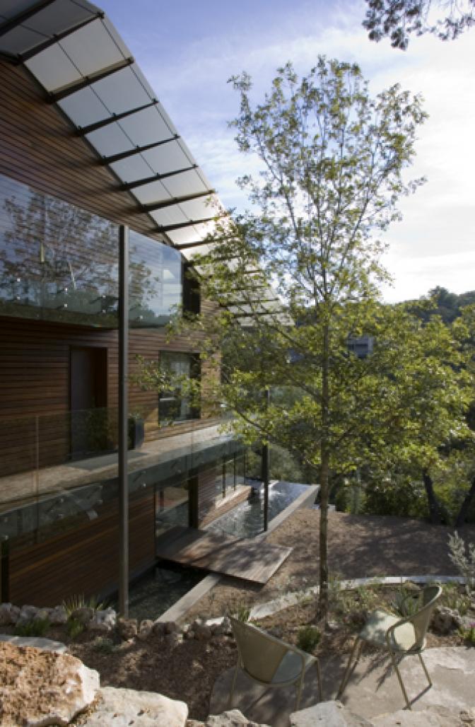 THE SELECTION OF PLANTS IN THE GARDEN ARE PRIMARILY PLANTS NATIVE TO THE CENTRAL TEXAS REGION. THIS MINIMIZES THE USAGE OF WATER, AND FOLLOWS PRINCIPLES OF XERISCAPING. THE GARDEN IS PLANNED AROUND EXISTING MATURE TREES AND SHRUBS WITH VARIOUS GROUND COVERS AND PERENNIALS. THE INTENTION WAS TO PRESERVE THE CHARACTERISTIC OF THE SITE AS MUCH AS POSSIBLE AND RETAIN THE ESSENCE OF A LANDSCAPE NATIVE TO THE EDWARDS PLATEAU IN THE HILL COUNTRY.