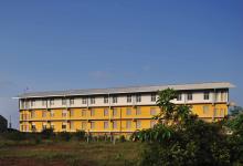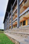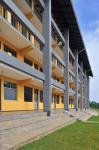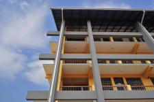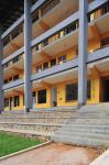 The façade facing the rear road and the housing settlement beyond has a comparatively solid character. The openings are comparably smaller and protected by overhanging pergola sunshades cantilevering out of the three storey face. The composition of solids and voids on this elevation has created a certain amount of privacy and a sense of discipline without making it too imposing. The triple height corridor created at the playground side, has linked the outside world and school premises visually, so that the school could maintain its required level of privacy without shutting the outside world completely. The column and beam grid framework structure on paddy field side define the edge of this triple height corridor verandah area of the school.