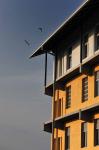 A mixture of Saffron and White walls and Grey paint finished column and beams were chosen as the colours for the school with sky blue soffits intended to merge with the sky at third floor level.