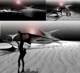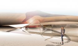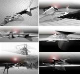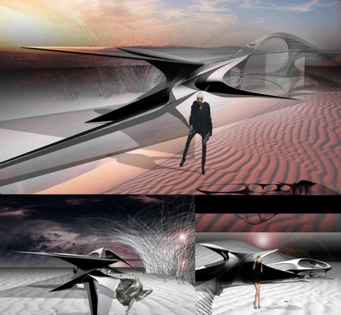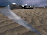 The design, influenced by the Ordos desert and it’s resonant sands, consists of two structures, one is a monocoque wooden frame construction using plywood to clad highly stressed parts of the internal frame; this skin provides strength in shear and compression. The fluid nature of the design reflects the changing landscape channeling light through the design via the folded atrium. The second part of the design acts as a harp, the pre-stressed striated steel frame is a sculptural element which may be clad in Teflon and fiberglass when necessary. This sculptural element mimics the resonant sands of Ordos