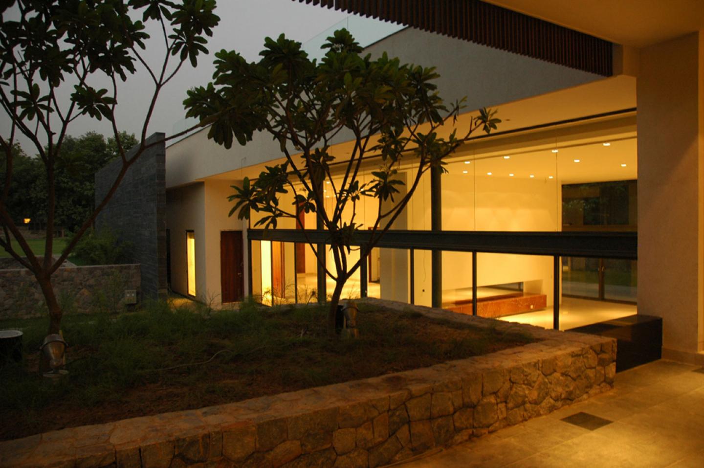 The plus house is conceived as a spacious house for an affluent young couple who entertain frequently. The ground floor spaces are for social entertainment the First floor is the private living space for the occupants. The living and dining spaces are accessed by walking half a level down from the entrance at the ground level resulting in a high ceiling for the entertainment areas. The spaces are flanked by sunken courts which allow spillover of the living spaces onto the landscaped areas.