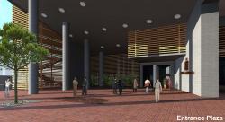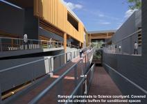 A civic institutional character dictates choice of materials. For easy maintenance and durability all buildings are proposed in textured, unpainted concrete, which is expected to be taken over in time by greenery. Retaining walls are of locally quarried yellow sandstone. Water is used as a cooling presence in the Arts and Humanities courtyard where building heights are too low to provide shadow. Terra-cotta tiles are chosen for exterior spaces to resist heat, and all roof surfaces are covered with white gravel to reflect solar heat as well as noise from the airport.