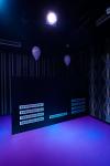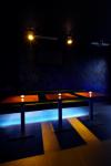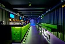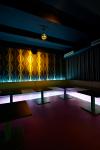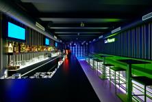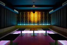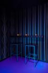 Krystof Blazek created interior design for music and cocktail bar La Fuente in Prague, Czech Republic. Blue-violet concrete floor in the main area is smoothly contrasted with pastel green seating and nine meters long coated bar in the same colour. Black painted ceiling and walls covered by classical and a bit op-art wallpapers makes visitors feel very cozy. Dimmed light supports unique atmosphere of the space. Vertical lines, black and white curved lined wallpapers on the walls, magenta concrete floor and champagne seating make the lounge room very pleasant. Mix of traditional and modern elements creates harmonious and charming interior of La Fuente.