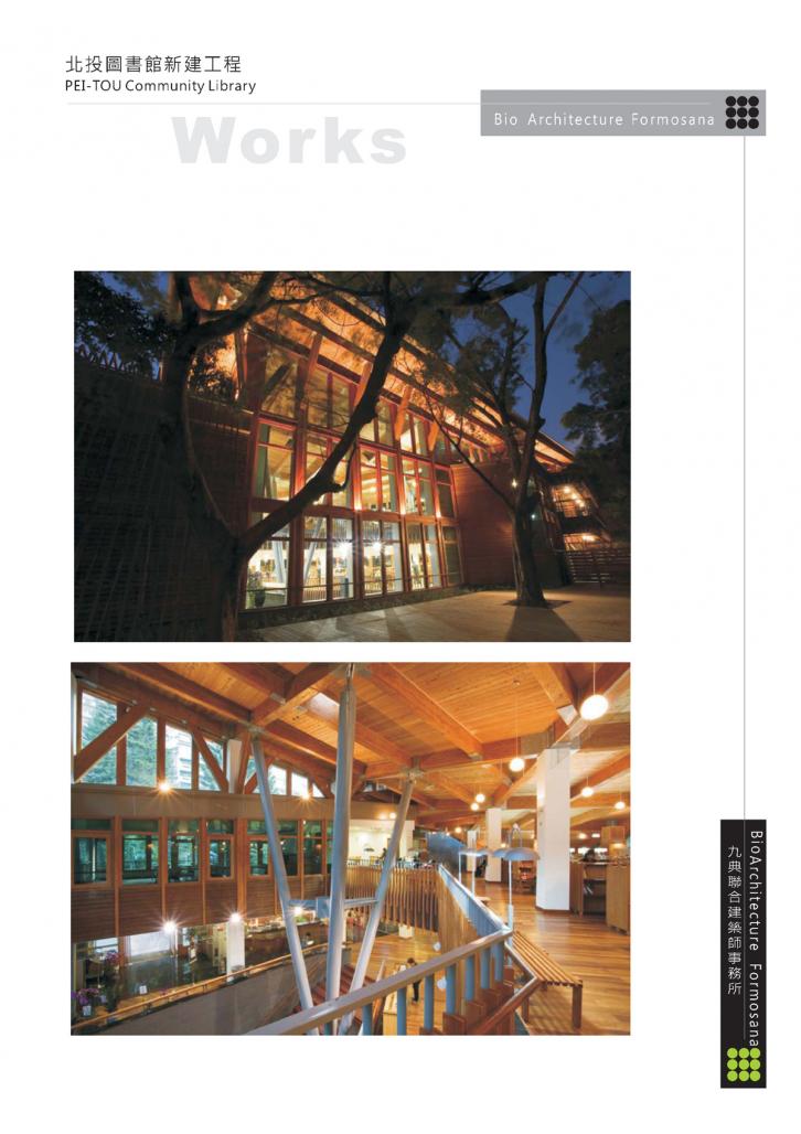 The building focus on ecology and green architectural design, implementing sustainable methods such as solar energy, rain water collection, green roof, rain waiter penertratable pavement, recycled materials. It is a multiple learning center, full of joy, health, nature and culture. It is also a great reading room for the whole community. Pei-Tou Library is by far the only ” Diamond grade” green building in Taiwan.