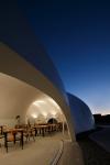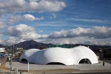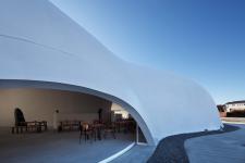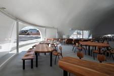 This building seems to belong to such nature objects as mountains and clouds. It is made from soft geometry, which will not arise from the figures like quadrangles and circles. By continuously operating innumerable polygon mesh points, we have determined the shape that clears the conditions such as the consistency as shell construction and the undulations that ward off rainwater in spite of its free geometry. The RC shell with cubic surfaces creates such spaces as 530 square meters of seats, 140 square meters of kitchens, and 50 square meters of rest rooms, in such a manner that it envelops and opens them.