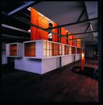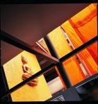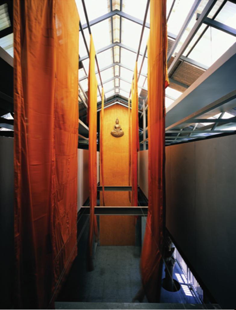 A striking orange robe on the grey wall can be seen from every corner of the building. The architect intends to employ this symbol to convey the simple principle of Lord Buddha, while the south wall is painted in gold and leads to an image of the Buddha, made by Eakapol Srisuwithanon. The fossil of trees placed on the ground also refers to Buddhist philosophy.