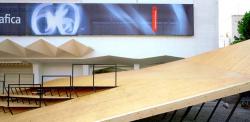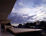 A wave of larch boards supported breaks against the Palazzo del Cinema in the island of Lido in Venice. It impresses a new sign on the venetian scene: a catwalk for the entry of actors and film directors as well as an organised space for photographers. Supported on a serie of steel struts, the wave is a catwalk that keeps the public near and far at the same time.Like the deck of a ship setting sail for a great adventure. The moment of the actors arrival is an explosive and magic one but it last a second as when the wave breaks itself on the beach, leaving a corrugated soil on the threshold between earth and water.