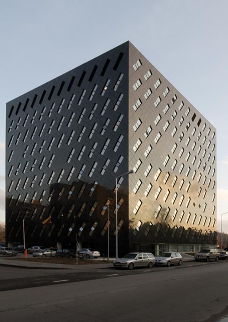 the strict composition of the cube in black is conceptually supplemented with a rhythm of oblique windows that brings drive and dynamism, which is also an inseparable part of the activity of the prosecutor’s office, to the static character of the building. the overall heavy, stable form has been provided with the elements of dynamics. in this way, a visual motion appears. it is a change and a fourth dimension, giving atypical qualities to the static form, activating it, and turning it into a hypersurface. here hyper?– is not in binary relation to the surface. it is a new notion that describes a complex condition of architectural surfaces.