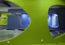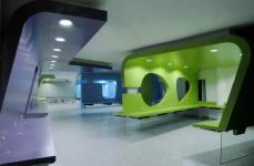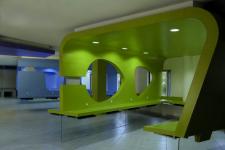 The whole mass is anchored from the top, leaving the entire space clear of any visual obstructions at the floor level. The work stations on either side are divided by 12thk clear float glass at the bottom resulting in a levitating spatial matrix.