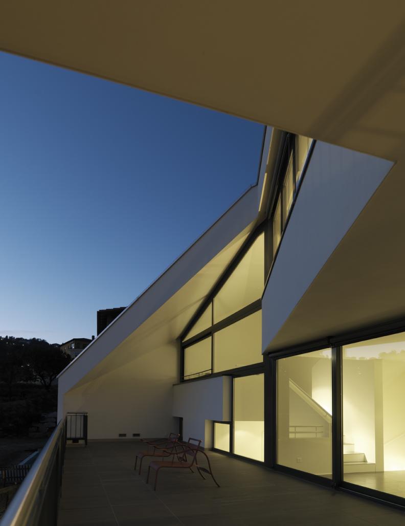 Nestled on the Alpine slopes north of Lugano, this house is characterised by a volumetric architecture that emerges from the terrain and follows the natural contour of the land. Its constructed volumes embrace the land in an organic and fluent sequence of spaces, each relating to each other and to the surrounding landscape. In order to communicate an identity and a language to the inhabitants, the project has a strong and precise form, its clearly identifiable geometric structure delimits an organised development of spaces. Carved in a clear square geometry, the spaces meet the slope and extend in a spiral, fluent movement that continuously changes the perception of the space and its relationship to the exterior, offering striking panoramic views across the hinterland and to Lake Lugano.