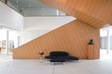 The offices are daylit both from the central courtyard and the narrow building depth. They are naturally ventilated, casting the offices and conference rooms against a bright and panoramic perimeter. The feel of the building is warm and yet precise: concrete exterior panelling matches beautifully with the local Swiss granite for the ground floor. The rhythmic pattern of the frittered glass and wood louvered façade, trips up the static concrete and stone palette. Whether approaching the building from its entrance or driving by it on the main highway the structure has an upbeat effect on the landscape.