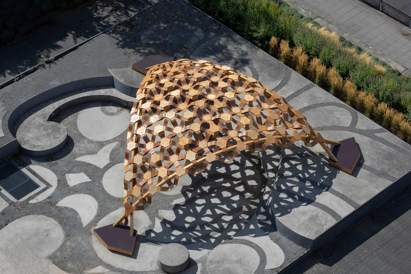 Within the structure, components interweave with each other, creating a segmented shell which resembles a 3D fabric in which the curved elements are connected to common nodes in all directions in space.