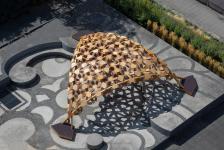 The pavilion, located at University Campus in city centre, Keplerstrasse 11, is a double-curved, parametrically designed segmental shell of light, single-curved wood and biocomposite elements, which are supported by three curved crossed wooden beams. The BioMat Research Pavilion demonstrates the architectural and structural potential of novel building materials made from agricultural production wastes.
