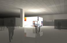 A floor covering as thin as possible, thus avoiding steps, provides easy handicap access. There is an intention to use Brazilian design furniture, especially those offered by the Niemeyer Foundation; until the availability of such furniture in Asia is confirmed, we selected furniture that is locally offered in Seoul. One long bench was arranged on the “Copacabana sidewalk” and two small benches on the “sand” pattern. As support furniture, a small cabinet also built in luminous surfaces, containing the event’s moto on its front, will keep pamphlets, corporate gifts and receptionist’s belongings. Such layout allows free visitor circulation, promoting fuller interaction the content to be presented.