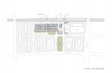 The design concept for the six storey parking structure features a layered envelope strategy to overcome the mundane nature of the typical parking structure as well as to provide a shield from car headlights for the surrounding residential development. The precast structure is wrapped by a sculptural veil of expanded aluminum mesh which is inflected and fractured by the vehicle entry points, the glazed vertical circulation towers and pedestrian bridge connection to the rail platforms. This larger folding texture of the façade is complimented by a finer texture of vertical slot openings that provides visual interest at the pedestrian level and from surrounding buildings as well as views from within the structure. Inside the sculptural veil resides an additional inner skin of woven stainless steel mesh that serves as a guard for pedestrians, while a tension cable system serves as a car barrier. This multi-layered system serves to maximize the level of natural light and air entering the building while at the same time mitigating light spillage onto neighboring residential properties. The result is a dynamic facade treatment that both obscures and reveals an otherwise typical parking structure and the vehicular circulation within it.