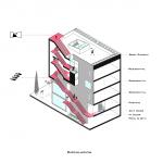 The width of the building was divided into 3 sections, organizing the interior spaces. The semi open balcony is located in the middle division in both plan and section, and all the vertical circulations are placed in one division to optimize space utilization throughout the building.