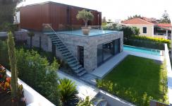 The upper box is enveloped entirely in aluminum profiles, with sliding-folding shutters made from the same material, creating a sleek box-like appearance when closed. In contrast, the lower box's facade is constructed from natural stone, emphasizing the generous windows that frame the captivating sea view.