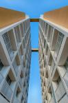 The Buildings are orientated in such a way that openings of the buildings comes in East - west directions, Which allows mild sunlight to enter in house for a healthy living. The southern facade does not having any opening Moreover to reduce the southern heat of sunlight, a wall has been provided which not only hide services but also act as a barrier to southern sunlight's heat.