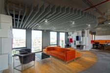 OSO Architecture followed mainly the open plan office principles while designing the working areas. However, in order to minimize some disadvantages of open plan design; such as acoustic and repetition problem of working tables; some precautions had been taken by OSO Architecture. Which, some social areas like a lounge and library were integrated among the working areas. Furthermore, special rock wool panels were used on the ceiling as a suspended ceiling material, in order to reach the acoustic comfort into the open office spaces.